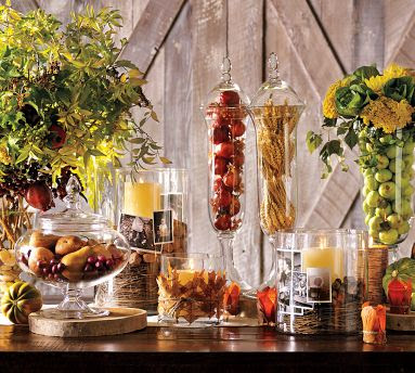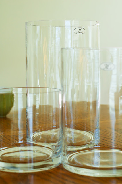 These have been on my wish list for a very long time. I've seen them around in very lightweight glass, but these are nice and thick. Their price: $39, $49 and $59. My price: $3.99, $4.99, and $5.99 at TJ Maxx again. Major score! I want to use them for a centerpiece for the fall and Christmas and fill them with fillers and candles, like this: