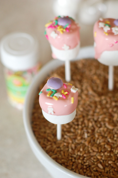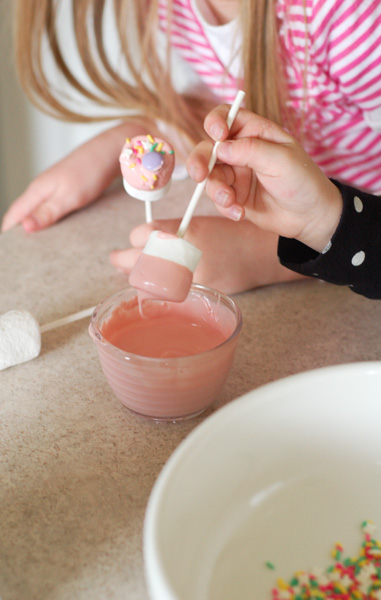 Step 2: Dip the marshmallow about half way in a cup of melted pink candy melts.