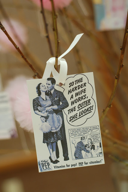 I had these branches and glass jar left from the wishing tree at Patrick and Ashlee's reception in January. I created a "spring-ish" tree for the serving table by adding tulle pom-poms I made. I also tied a variety of vintage ads to the branches.