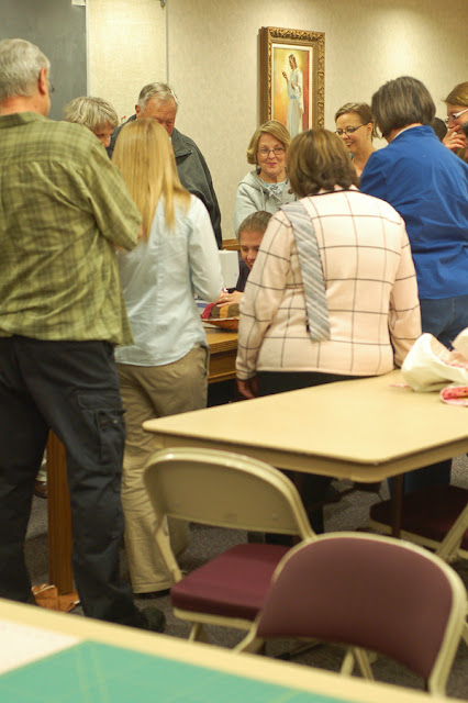 Set up was relatively simple. We used the cultural hall all but the last week. The first night (rotary cutting/sewing), we had one section of tables for cutting and another set for the sewing machines. Our demo table was placed in the center. The following two weeks we only needed tables for sewing machines. (All rotary cutting was done on the first night.)