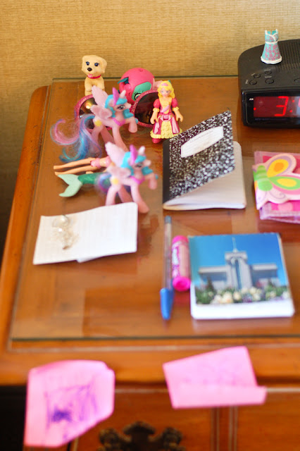 The first thing Ella does when she arrives at a new location is "set up" her room. For small children, familiarity makes them feel more safe and secure. Home is a safe place. So we allow her to choose a few "treasures" from home to bring along. When we arrive at our destination, she arranges them in a special place or just keeps them close by. The point is, find something that will make your little one feel safe and secure in an unfamiliar environment.
