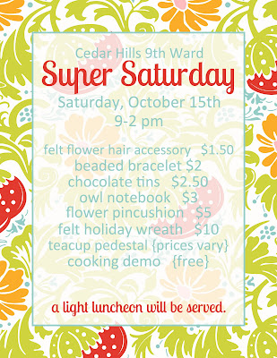 Whew! Another successful Relief Society meeting under our belts. Super Saturday is an activity held once a year for the women in our church. We get together to socialize, craft, learn new skills, and eat. Yep, it's good times. I was on the Relief Society Board for this event and there's a lot of planning and work that goes into it. I've put together a simple list of things we've learned.